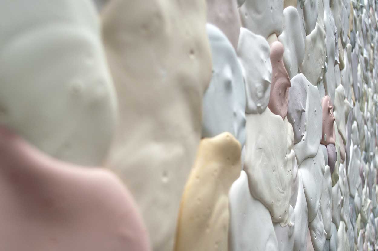 Cette installation a d’abord été réalisée au sol puis relevée dans l’espace. Une face est donc plate et l’autre en volume. Elle mesurait 310×140 cm.
