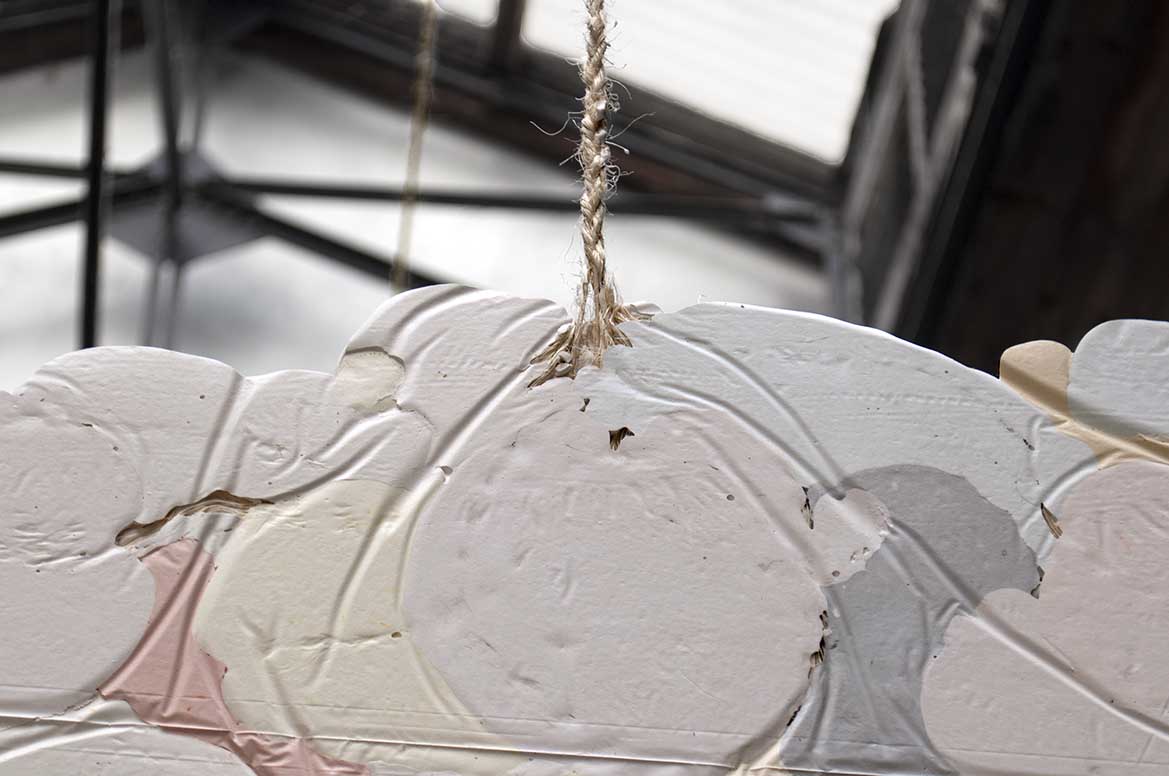 Elle est constituée de plâtre naturel coloré dans la masse. Des ficelles tressées, prises dans les ronds de plâtre, assurent la suspension de l’installation.